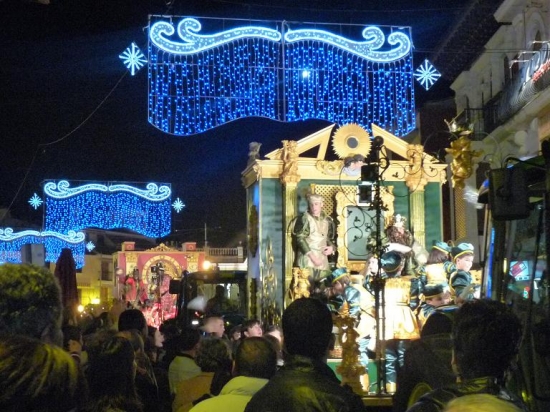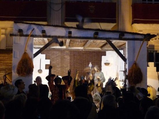Durante todo el recorrido hubo un magnífico ambiente, con las calles llenas de gente. Mucha expectación en la Plaza de España, cuando al finalizar la Cabalgata, los Reyes Magos, acompañados de sus pajes y de los demás participantes del cortejo, llegaban ante el Portal de Belén instalado en la puerta del Ayuntamiento, para realizar la ofrenda al Niño Jesús. Tras la intervención de la Escolanía del Centro Filarmónico Egabrense, dirigida por Alfonso Fernández; Mª Eugenia Vilchez daba la bienvenida a SSMM procediendo a dar lectura al Evangelio que narra el pasaje de la adoración de los Magos al Niño Jesús. A continuación Melchor ofrecía oro, simbolizando la realeza de Jesús; Gaspar, incienso, como símbolo de la divinidad y Baltasar, mirra, representando esta ofrenda la humanidad del Niño Dios.