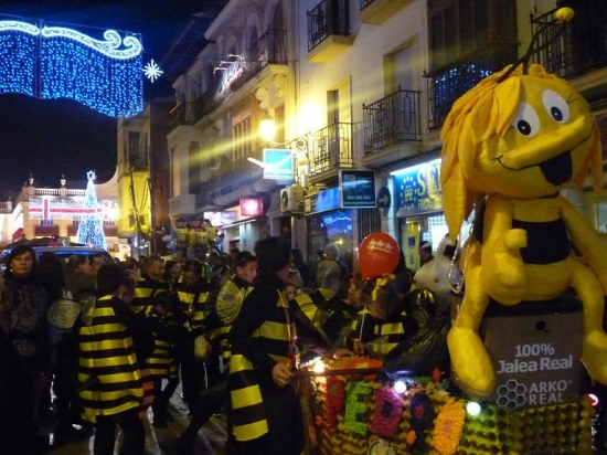 Tres bandas de música ambientaban el recorrido entre las carrozas junto a cientos de figurantes de la Asociación Atrévete que, en su décimo aniversario animaron tanto en carroza como a pie. También los componentes de Gym Fusion, pusieron una nota de piruetas de calle realizadas por bailarines y gimnastas ataviados con el disfraz de los invencibles. También los vecinos de la urb. Pedro Garfias se sumaban al recorrido vestidos de "abeja Maya".