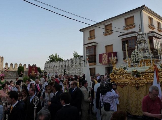 Poco después de las ocho de la tarde, el campanario de la Asunción, echaba a repicar todas sus campanas para anunciar la salida del Santísimo Sacramento en procesión. Niños y niñas de primera comunión, representaciones de cofradías de Semana Santa, Agrupación de Cofradías, hermandades filiales del Rocío y de la Cabeza (cuyas hermanas lucían mantilla negra), Cofradía de San Rodrigo, Archicofradía de la Virgen de la Sierra, representaciones de la Adoración Nocturna masculina y femenina y la propia Cofradía del Santísimo, precedían el paso de la Custodia con el Señor. Tras el paso, los párrocos de San Francisco y San Rodrigo, de Santo Domingo y de la Asunción, éste último revestido con capa pluvial; el palio de respeto, que fue llevado en distintos turnos; congregaciones religiosas (Hijas de la Caridad, Franciscanas - Darderas, Escolapias y Hermanitas de Santa Teresa Jornet) y la Corporación Municipal presidida por el Alcalde, Fernando Priego acompañado por sus Tenientes de Alcalde y miembros del Gobierno municipal, así como la concejala socialista Loli Salido. Cerraba el nutrido cortejo la Banda de Música de Cabra.