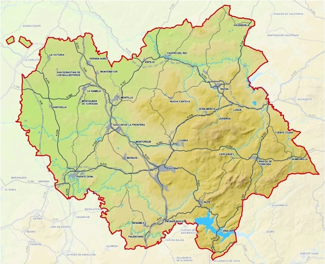 Los municipios que componen el ámbito del POT son Aguilar de la Frontera, Almedinilla, Baena, Benamejí, Cabra, Carcabuey, Castro del Río, Doña Mencía, Encinas Reales, Espejo, Fernán Núñez, Fuente-Tójar, Iznájar, Lucena, Luque, Montalbán de Córdoba, Montemayor, Montilla, Monturque, Moriles, Nueva Carteya, Palenciana, Priego de Córdoba, Puente Genil, La Rambla, Rute, San Sebastián de los Ballesteros, Santaella, Valenzuela, La Victoria y Zuheros.