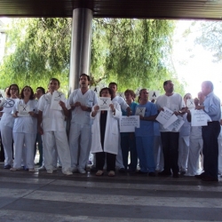 En torno a dos centenares de trabajadores del Hospital Infanta Margarita de Cabra han mostrado en esta mañana su enérgico rechazo a los recortes propuestos en el Sector de la Sanidad con gritos como "Griñán, Rajoy, de aquí no me voy" o "Griñán, Valderas, no me toques la cartera" frente a las puertas del Recinto Sanitario. Cabe destacar que en la manifestación sólo se han mostrado carteles alusivos a los recortes que se practicarán como un folio con un lazo negro que rezaba "Luto por la sanidad" o unas tijeras donde bajo ellas podían leerse las palabras "sanidad, salarios, calidad". Estos han sido los únicos carteles que han podido verse en la propuesta ya que las fuerzas sindicales con representación han decidido no portar sus emblemas como símbolo de unidad de los Sindicatos frente a la política de recortes que se pretende llevar a cabo.