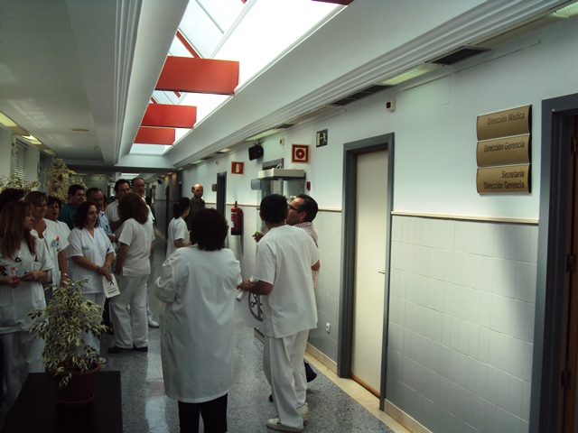 Tras estas intervenciones, los trabajadores se dirigieron a la segunda planta del Hospital para mostrar su rechazo ante la misma puerta de la Dirección del Hospital Infanta Margarita, donde han permanecido durante unos minutos bajo el grito "no está en el despacho, está en la feria"