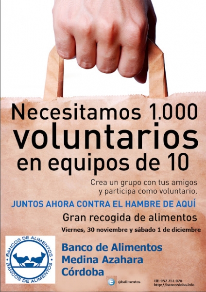 Los próximos días 30 de noviembre y 1 de diciembre, tendrá lugar una Gran Recogida de Alimentos, en la que participan los Bancos de Alimentos de toda la comunidad europea que pretende sensibilizar y movilizar a la población sobre la realidad actual de la pobreza en nuestra provincia, y a la vez favorecer una colaboración continuada con el Banco de Alimentos durante todo el año. El objetivo es recoger 100.000 Kg. de alimentos nutritivos de larga duración, como arroz, pasta, legumbres, leche y aceite. El Banco de Alimentos Medina Azahara de Córdoba está inmerso en esta gran recogida y prepara en estos días un dispositivo capaz de recoger en esas dos jornadas esos 100.000 kilos de alimentos.