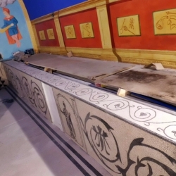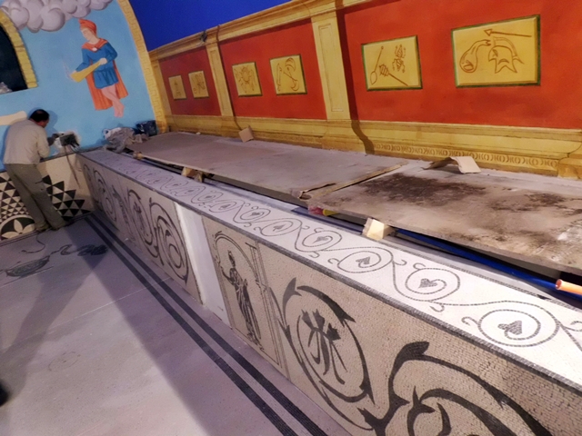 El profesor Luis Paltré junto a un grupo de alumnos de Bachillerato se han encargado de decorar la estancia con los cánones tradicionales de las habitaciones nobles de época romana y por último el frontal nos ofrecerá la presencia de dos dadóforos acompañando al Mitra central. En estos momentos un grupo de operarios contratados por el programa especial de empleo de Diputación están colocando los mosáicos y centrales.