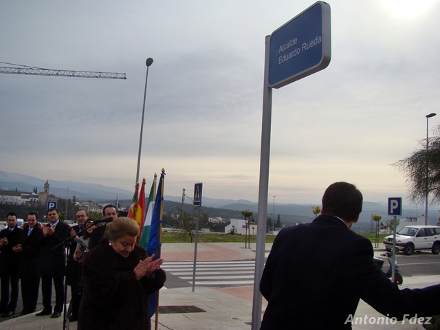 Por último, toda la comitiva se dirigía hacia una de las calles de la nueva urbanización PAU-R2, en la Cuesta de los Barreros donde se descubría la rotulación de una calle bajo el nombre "Alcalde Eduardo Rueda", que fuera Alcalde de esta localidad en la época de la transición además de Director de "las Escuelas", impulsor de CIATE, Hermano Mayor de la Hermandad del Cristo del Socorro (Silencio) y Presidente de la Agrupación de Cofradías de Cabra.