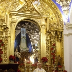 Tras visitar el Museo de la Pasión, cuyas reformas está ultimando la Fundación Aguilar y Eslava, d. José Burgos presidió la misa de acción de gracias en la parroquia de los Remedios, de la que ha sido párroco desde su creación y hasta su reciente jubilación. En la homilía señalaba los vínculos que mantiene con Cabra, su devoción hacia la Virgen en sus advocaciones de la Sierra y de la Soledad, así como la estrecha relación que mantiene con la Fundación e Instituto Aguilar y Eslava, desde muy pequeño, luego como estudiante, profesor, director espiritual y en la que fue reconocido como alumno benemérito hace algunos años. Por parte de la fundación se le hizo entrega de la insignia de plata que le impuso el presidente, Salvador Guzmán. En sus palabras dio gracias a Dios por todo lo que ha recibido en su vida, "marcada siempre por la Providencia" - dijo - y también para el pueblo de Cabra por las numerosas muestras de afecto recibidas a lo largo de su vida, considerándose egabrense e indicando que "cuando Dios quiera, aquí quiero quedarme para siempre".