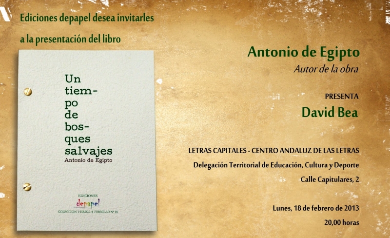 Diplomado en Biblioteconomía y Documentación por la Universidad de Granada, Antonio de Egipto es editor del sello cordobés El Páramo. Desnudos en la ciudad y La Maleta son sus dos poemarios anteriores.