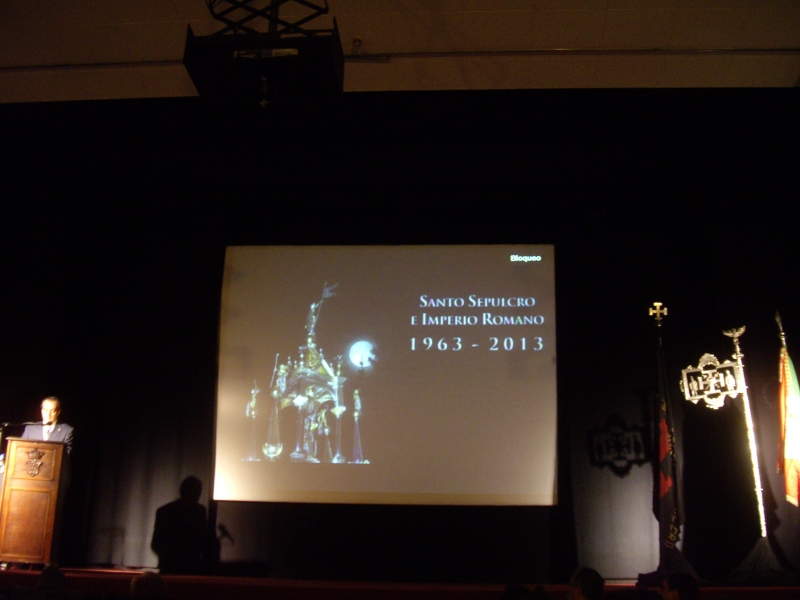 El pregonero recreó también sus recuerdos familiares desde el barrio de Santa Lucía y su vinculación a través de su padre al Imperio. También fue mencionando a personas que han tenido un papel relevante en la historia reciente de la Cofradía del Sepulcro y del medio siglo del Imperio Romano. Como homenaje a todos estos cofrades, incluyendo a los diez pregoneros que le han precedido en este acto, Salvador presentaba un audiovisual conmemorativo con algunas imágenes inéditas de la historia de las cuadrillas de romanos de nuestra ciudad.