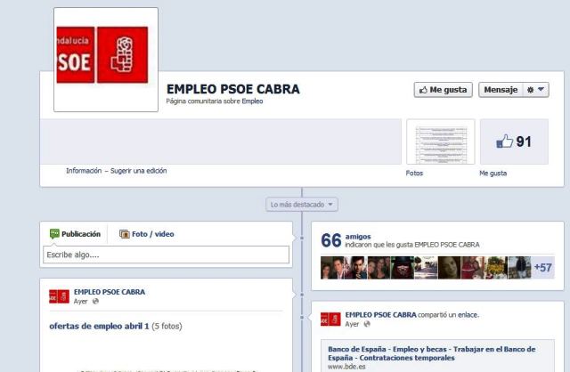 El PSOE de Cabra ha presentado esta tarde en su sede la "Fan Page" de Facebook que han puesto en marcha hace unos días en dicha red social y que intenta "paliar de alguna forma desde los recursos de la Agrupación socialista" la situación de desempleo que muchos ciudadanos sufren en la localidad. Roldán ha recordado la preocupación "constante" del PSOE de Cabra por el desempleo en la ciudad a través de la presentación de una moción por el empleo local pues cada día se incrementa más la tasa de desempleados egabrenses.