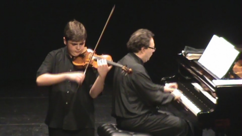 Los asistentes estaban eufóricos con lo que estaba escuchando y el remate vino con "Introducción y Tarantela Op. 43" de P. Sarasate (1844-1908). Sarasate siempre despierta en el público algo así a como se dice en el circo, "más difícil todavía", y Carlos dejó al respetable asombrado con su interpretación haciendo filigranas con el violín, trinos, coloraturas, armónicos, pizzicatos...El público puesto en pie aplaudió "a rabiar" a ambos intérpretes, y se sentó otra vez Arnold W. al piano y Carlos se colocó el violín y nos dieron un bis que sonó "a gloria", el 3er mov. "Scherzo.Allegro" de la "Sonata" de Beethoven que habían hecho en la primera parte, con el que terminó la espléndida noche musical del Teatro "El Jardinito". El público salió satisfechísimo y los padres de Carlos recibieron los plácemes de los asistentes, por la actuación de su hijo Carlos.