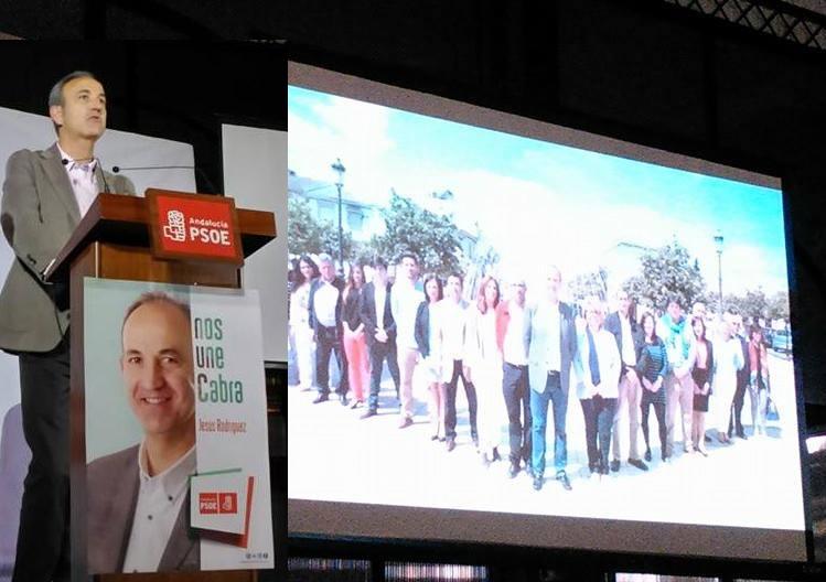 Por su parte, ya en la noche del sábado y en el Salón Carmen, el PSOE convocaba a sus seguidores para presentar la candidatura que encabeza Jesús Rodríguez Alcázar y que cierra la ex ministra de Cultura, Carmen Calvo Poyato. Los candidatos socialistas llevan como lema de campaña "Nos une Cabra".