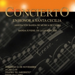 Este año la fiesta de la patrona de la Música cae en domingo, razón por la que ese día tendremos actividades, como es el caso de la Asociación Instructivo Musical Banda de Música de Cabra que en su Concierto de Santa Cecilia, contará también con la participación de la Banda Juvenil de Música (que este año celebra su décimo aniversario) dirigida por Víctor Herrero Pareja. Junto a los jóvenes músicos, el concierto del 22 de noviembre de la Banda Sinfónica de Música de Cabra contará con la participación como solistas de: