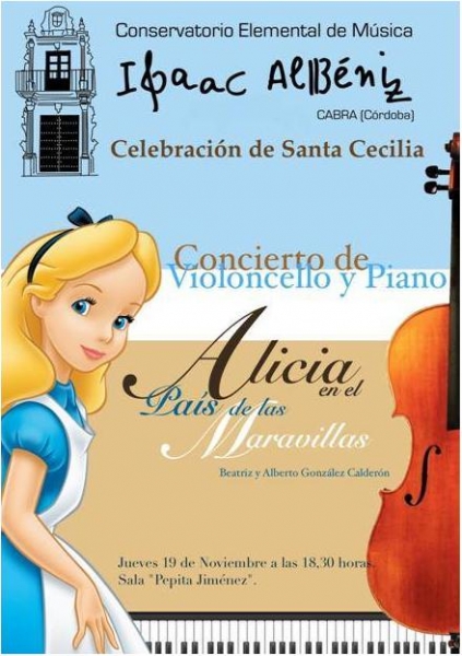 El Conservatorio Isaac Albéniz ha organizado para el jueves 19 de noviembre, en el patio de la casa natal de Juan Valera, el concierto "Alicia en el país de las maravillas", de violoncello y piano a cargo de Beatriz y Alberto González Calderón. Será a las 18:30h y la entrada es libre.