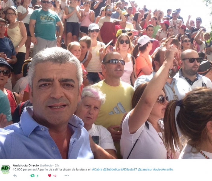 Según ha tuiteado Modesto Barragán, de Andalucía Directo, que han estado grabando un reportaje para emitirlo en Canal Sur TV, unas 10.000 personas han participado en esta jornada festiva de un nuevo 4 de septiembre acompañando a la Virgen de la Sierra.