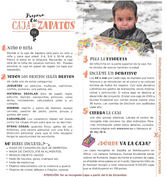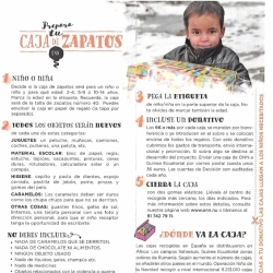 Los regalos consistirán en coger una caja de zapatos y llenarla con juguetes, materia escolar (bloc de papel, regla, estuche, lápices, sacapuntas, pinturas, ceras, rotuladores, calculadora solar...) productos de higiene (cepillo y pasta de dientes, espejo cerrado, pastilla de jabón, peine, pinzas y gomas del pelo...) caramelos y otras cosas (como guantes finos, gafas de sol, linternas...). También se puede incluir una tarjeta personal con una foto y la dirección personal para que los niños puedan escribir y responder a sus obsequiadores. A la entrega de la caja se deberá añadir un donativo de 6? para cubrir los gastos de transporte y envío.