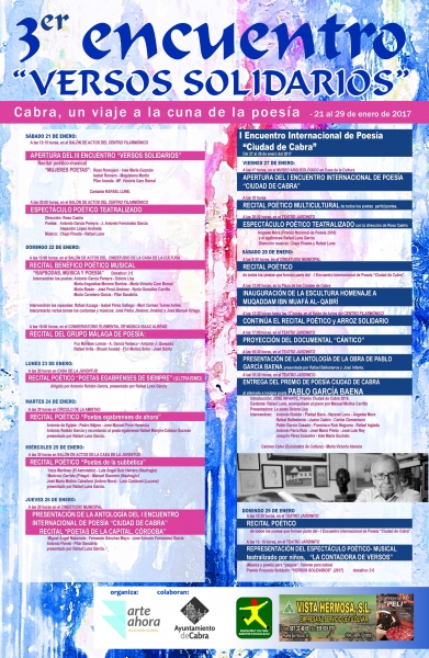 De la misma manera, en el ámbito del ENCUENTRO "VERSOS SOLIDARIOS" se instaura y ve la luz el I ENCUENTRO INTERNACIONAL DE POESÍA "CIUDAD DE CABRA", que se celebrará (D.m.) del 27 al 29 de enero de 2017, con más de 70 poetas de todas las partes del mundo. Como acto central de las actividades que llegan a su punto final el próximo fin de semana va a tener lugar también la entrega del PREMIO DE POESÍA "CIUDAD DE CABRA" (2017), el sábado 28 de enero de 2017. que recogerá el considerado el mejor poeta vivo español de la actualidad, Pablo García Baena, a las 19:30h en el Teatro El Jardinito de nuestra ciudad.