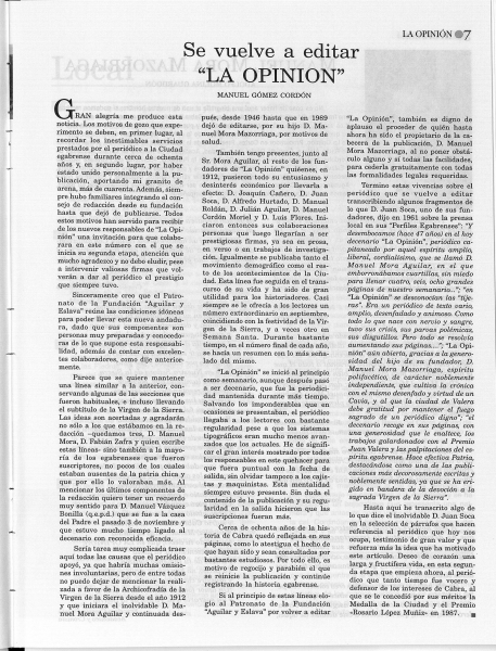 Desde entonces, la nueva propietaria de La Opinión ha querido mantener el espíritu de un periódico local bajo los principios que la han definido sinceridad e independencia, como reza en nuestro lema desde aquellos primeros números que se editaron en 1912 como semanario independiente, defensor de los intereses de Cabra y su distrito.
