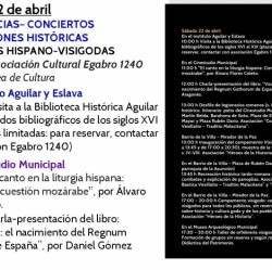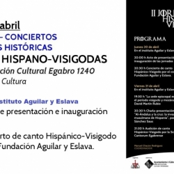 Esta tarde a las 20:00h se inauguran las jornadas en la Fundación-Instituto Aguilar y Eslava con una presentación de las mismas y a continuación un concierto pedagógico a cargo del coro de la Fundación Aguilar y Eslava, dirigido por Mª José Villatoro Campaña, que ofrecerá una muestra de cantos hispano-visigodos.