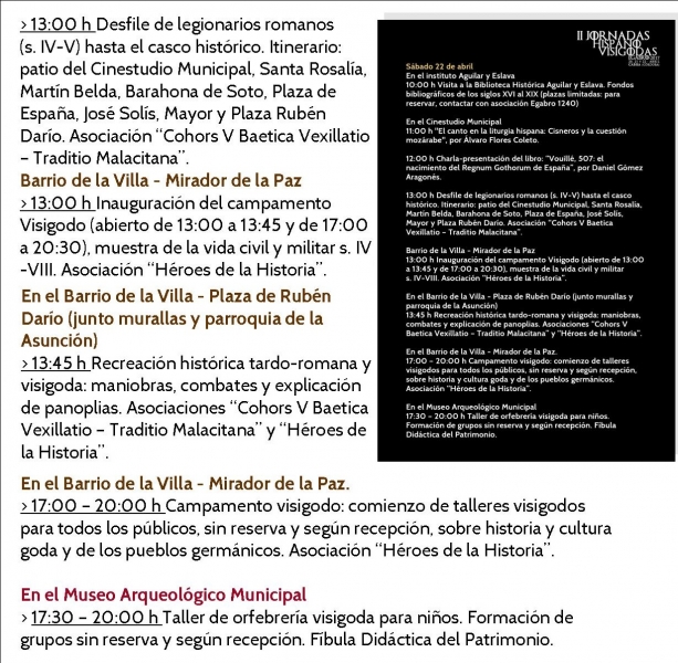 A lo largo de estos tres días tendrán lugar conciertos, presentación de libros, visita a la biblioteca histórica Aguilar y Eslava, recreaciones históricas, talleres para todas las edades, conferencias, desfile hispano-romano y otras recreaciones de la época en la que podremos conocer de primera mano tanto la indumentaria y costumbres de la cultura hispano-romana y también del mundo hispano-visigodo y godo en general. En estas actividades colaboran las asociaciones "Cohors V Baetica Vexillatio - Traditio Malacitana" y la Asociación "Héroes de la Historia". Un taller de orfebrería para los más pequeños tendrá lugar en el Museo Arqueológico Municipal, realizado por Fíbula Didáctica del Patrimonio, donde aprenderán diversos aspectos sobre la cultura visigoda dentro de la realización del taller.