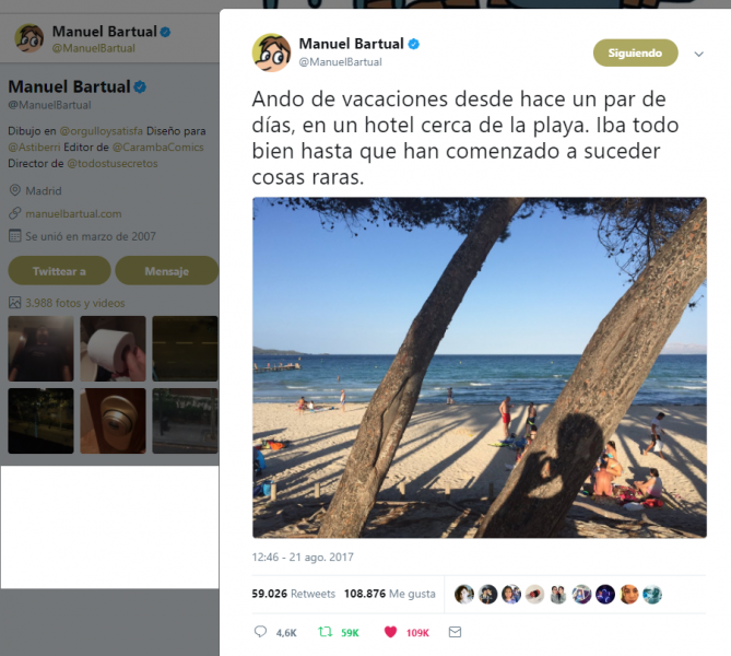 Según su biografía de Twitter, Manuel Bartual dibuja en la revista @orgulloysatisfa, diseña para @Astiberri y es director de la película @todostusecretos. Es un editor, historietista y diseñador gráfico que había comenzado sus vacaciones y se disponía a contarlas el pasado lunes.