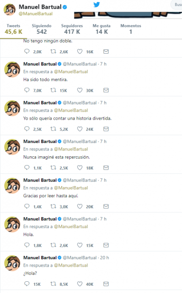 El sábado por la noche llegaba el final, o eso parecía. Pues ha sido durante el domingo cuando ha ido lanzando nuevos mensajes en la red señalando que no imaginaba esta repercusión y que solo quería contar una historia divertida, para decir que "Ha sido todo mentira. No tengo ningún doble".