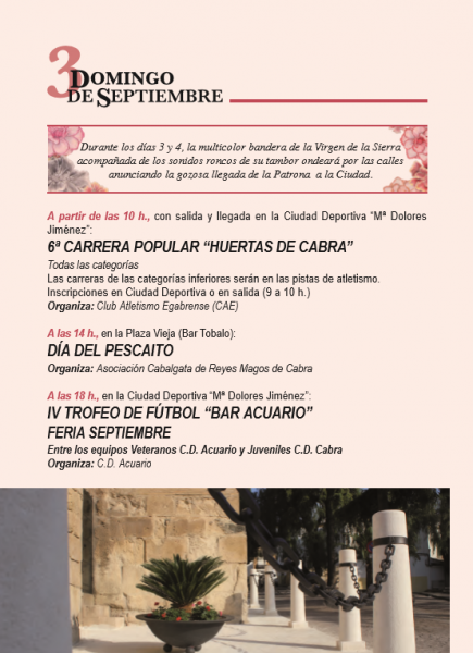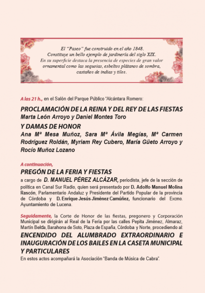 Además el 3 de septiembre sirve también de pórtico oficial a las fiestas con el pregón que esta noche tendrá lugar en el Salón del Paseo, a cargo del periodista egabrense Manuel Pérez Alcázar a quien presentarán dos amigos de la infancia, Adolfo Molina Rasón y Enrique Jiménez Camuñez. Será a las 21:00h cuando comience el acto de proclamación de la corte de honor y tras él se desarrollará el pregón.