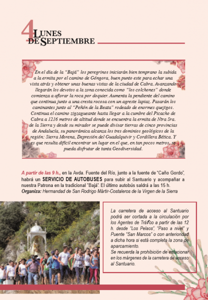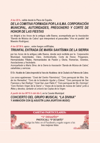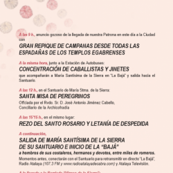 Este día viene marcado por el ajetreo y la impaciencia de comenzar las fiestas con la bajada de la Virgen. Atrás queda el eco de un pregón sentido y emotivo, bien escrito y mejor dicho que en la noche del 3 de septiembre abría oficialmente el pórtico de la Real Feria de Cabra unida a las Fiestas en honor de Nuestra Señora de la Sierra.