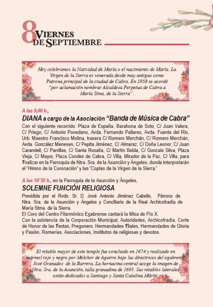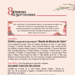Llegamos al 8 de septiembre, Día de la Sierra, que se abría esta mañana con la Diana a cargo de la Banda de Música de Cabra y que recorrió nuestras calles interpretando, entre otros, el clásico Despierta Sierrita del Maestro Rodríguez.