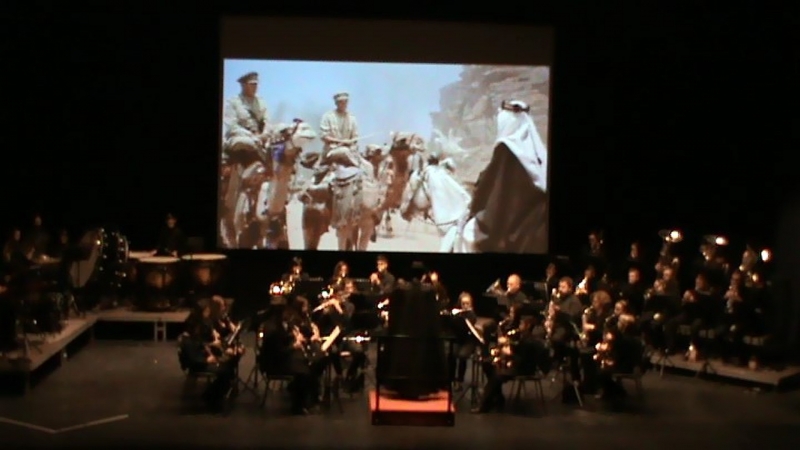 La pantalla situada al fondo de la escena, nos presentó, como lo haría con los restantes, un fragmento de la película "Laurence de Arabia" cuya banda sonora, del francés Maurice Jarre (1924-2009) se dijo por los chicos y chicas, entre los que había alguno de sus profesores, con un sonido espléndido. Un lujo, para la filmación que se proyectaba, mientras la música discurría con gran ejecución, hecha por la Banda Juvenil. Y en efecto era un lujo, si lo comparábamos con los principios del cine, en que la música que se oía era la de un piano, acompañando a una película muda.