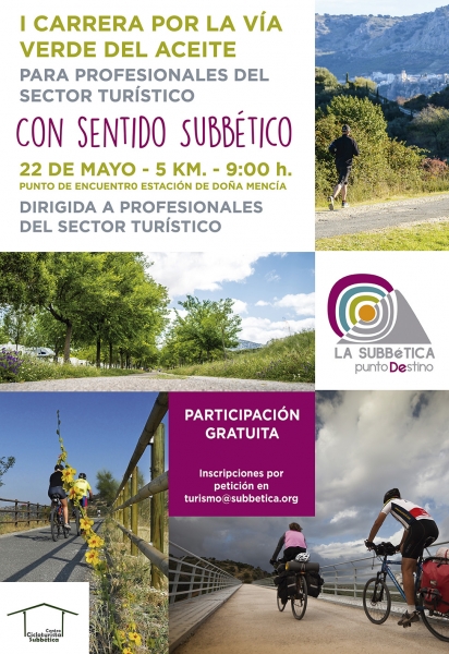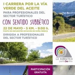Se trata de la I CARRERA POR LA VÍA VERDE DEL ACEITE PARA PROFESIONALES DEL SECTOR TURÍSTICO, incluyen así a cuántas personas forman parte de este colectivo (agentes tanto públicos como privados) que trabajan en pro del mantenimiento, conservación, mejora, promoción y comercialización de la Vía Verde en su conjunto.