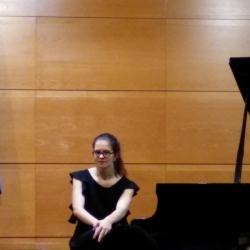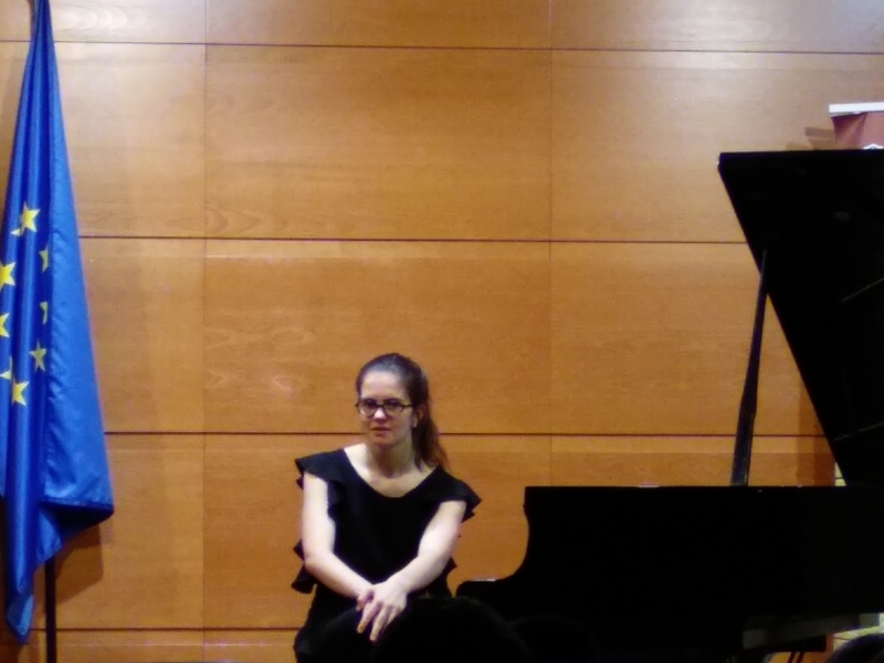 El día 22, otra alicantina, nacida en la capital, Isabel Seva Merín, ya en el 4º curso de Piano en Madrid, el último curso en la cátedra de Cayuelas, nos hizo la "Fantasiestücke Op. 12" de R. Schumann (1810-1856) obra capital de la producción pianística romántica, conjunto de 8 preciosas obritas o piezas, compuestas por Schumann para su prometida Clara, que posteriormente se convirtió en su esposa. Una interpretación, la de Isabel, en la que alternó la música bien hecha, con pinceladas didácticas dichas con simpatía y muy inteligibles para el público escolar, lo que nos llevó a la conclusión de que domina el piano con pulcritud.