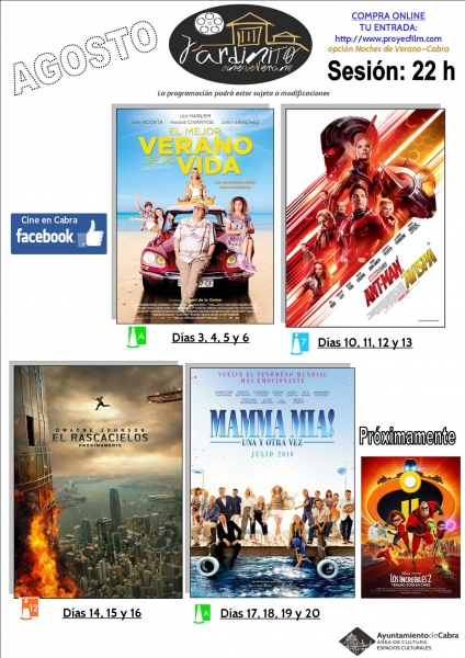 La próxima película que estará en cartelera será "Ant-Man y la Avispa" los días 11, 12 y 13 de agosto a las 20:00 y 22:00 horas. En la nota de prensa facilitada por el ayuntamiento de nuestra ciudad, se "quiere agradecer la comprensión de todos y pedir disculpas por las molestias ocasionadas".