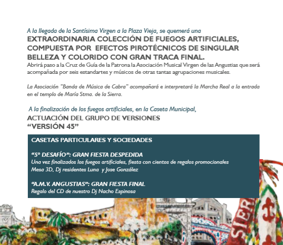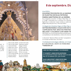 En el programa de hoy se recogen los actos religiosos con la función principal, la tradicional Misa de la Bandera y la procesión solemne que recorrerá las calles para festejar a la venerada y antiquísima imagen de Nuestra Señora, María Santísima de la Sierra, con la que se dará por cerrada la semana de fiestas.