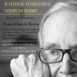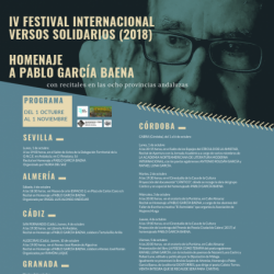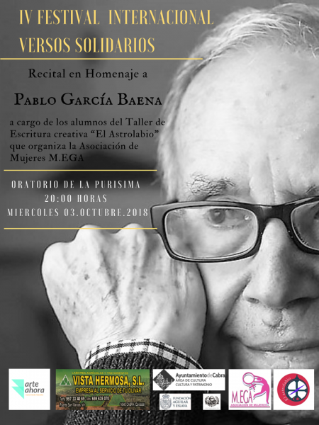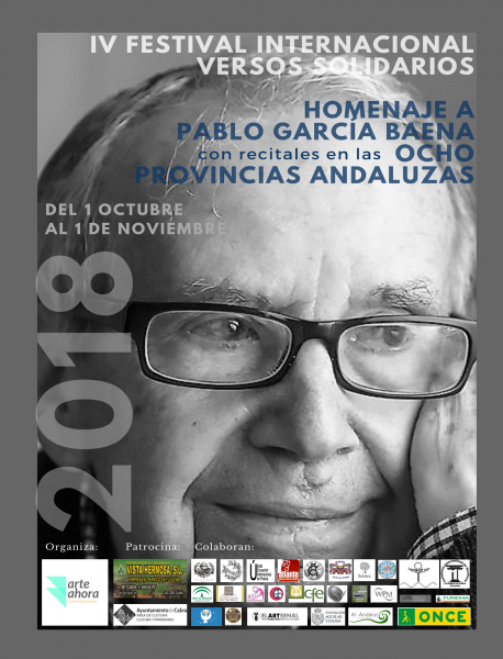 En esta cuarta edición, Versos Solidarios rendirá merecido homenaje al insigne poeta fallecido recientemente Pablo García Baena, ganador entre otros del premio Príncipe de Asturias 1984 y del premio de poesía Ciudad de Cabra 2017, con recitales de poesía en su homenaje en las ocho provincias andaluzas. En estos actos de homenaje a García Baena, se contará con la participación de poetas tan destacadas como Ángeles Mora, ganadora del premio nacional de Poesía 2016 y del premio nacional de la Crítica 2015.