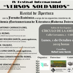 El Recital de Apertura, el día 1 de octubre, tendrá lugar en el Círculo de la Amistad de Cabra (Córdoba), estará a cargo de importantes miembros, en el Reino de España, de la citada Academia norteamericana de Literatura moderna internacional, con sede en Nueva Jersey. Durante la semana del 1 al 6 de octubre Cabra será sede de las actividades iniciales de este IV fesival Versos Solidarios.