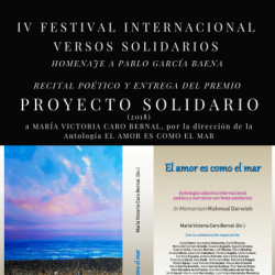 El día 6 de octubre, en el Centro Filarmónico Egabrense, se hará entrega del Premio Proyecto Solidario 2018, a la escritora Mª. Victoria Caro Bernal, por su continua labor social y en especial por la dirección de la antología colectiva internacional poética y narrativa con fines solidarios de título El amor es como el mar.