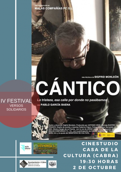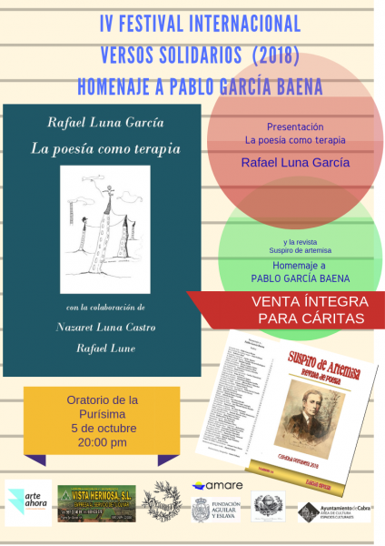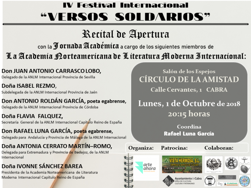 El IV Festival Internacional Versos Solidarios, organizado por Arte ahora, cuenta con el patrocinio de la empresa Vistahermosa S.L. y con la colaboración de diversas instituciones, organizaciones y colectivos, como la delegación de Cultura del Ayuntamiento de Cabra, la Academia norteamericanoa de Literatura Moderna Internacional o la Fundación Aguilar y Eslava. El evento se desarrollará entre el 1 de octubre y el 1 de noviembre en todas las provincias andaluzas, con un total de diecisiete actos, entre recitales de poesía, proyecciones, homenajes y entrega de premios.