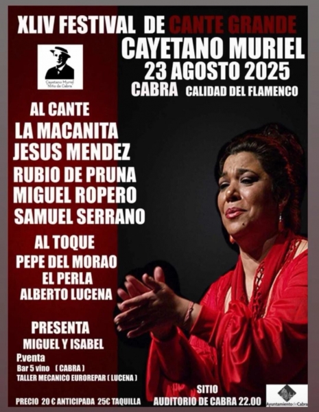 El próximo 23 de agosto de 2025, el Auditorio Municipal «Alcalde Juan Muñoz» de nuestra ciudad acogerá una nueva edición del Festival de Cante Grande "Cayetano Muriel", cita imprescindible en el calendario flamenco andaluz que celebra este año su 44º aniversario.