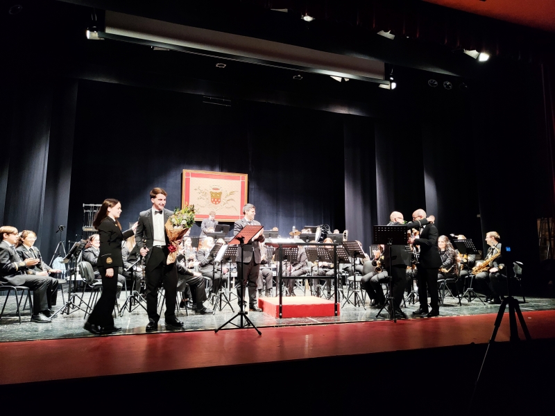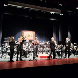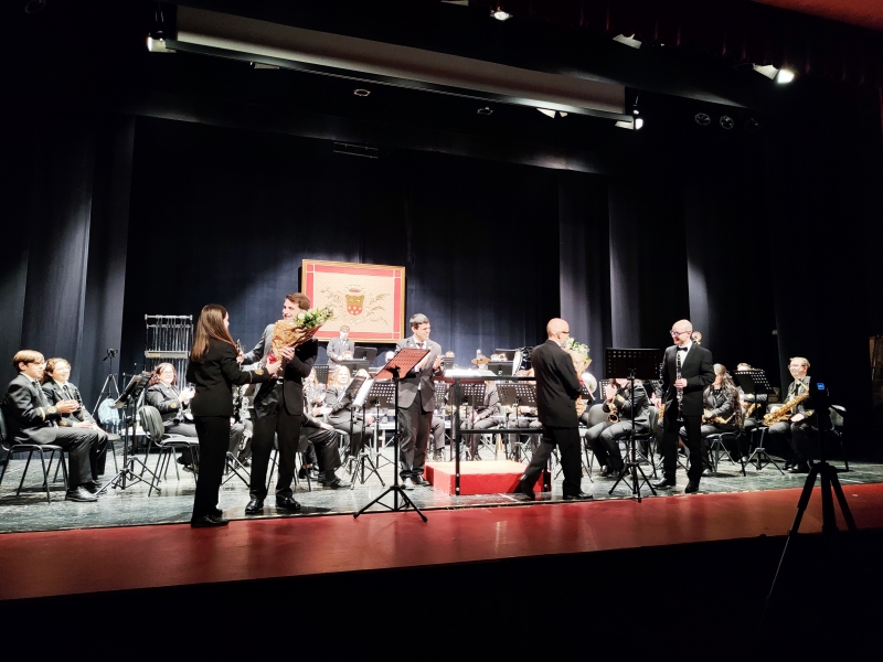 El cambio de carácter llegó con Jewish Soul Fantasy de Y. Povolotsky, arreglo de Miguel López León, y con los clarinetistas David Roldán y Víctor Herrero como solistas, impecables tanto en afinación como en expresividad en cada pasaje virtuosístico que presenta la obra. Su diálogo, lleno de inflexiones propias del repertorio klezmer, se vio realzado por una banda siempre atenta a su director, que supo sostener los planos sonoros respetando en todo momento a los solistas y con un acompañamiento muy bien equilibrado. Se trata de una fantasía basada en melodías judías tradicionales, combina escalas frigias y armónicas típicas de la tradición hebrea y ornamentación al estilo klezmer (glisandos, mordentes, portamentos...) con contrastes fuertes entre secciones festivas y otras de carácter más introspectivo. Queda sobradamente reflejado en esta versión, y en muchas otras, el gran dominio y maestría de la orquestación e instrumentación por parte de su arreglista y director, Miguel López. Hubo muchos aplausos, especialmente para los solistas ya que interpretaron un papel muy virtuosístico con total maestría, fueron obsequiados por parte de la Asociación Banda de Música de Cabra con unos ramos de flores, entregados por su presidente Rafael Sabariego Borrallo, y por Ángela Padillo, vocal de la junta directiva.