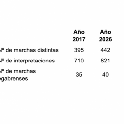 Se han interpretado 138 marchas distintas del estilo de cornetas y tambores, registrándose 242 interpretaciones.