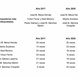 Abel Moreno continúa siendo un autor muy interpretado, aunque ha bajado algo con respecto al 2017, mientras que Víctor Ferrer, que en 2017 era el segundo compositor más frecuentado en los repertorios, ha desaparecido de los primeros puestos bajando de las 24 interpretaciones en 2017, hasta las 6 interpretaciones en este 2026. Un descenso muy acusado, sin duda.