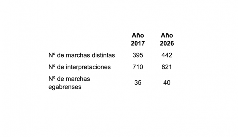 Se han interpretado 151 marchas distintas del estilo de banda de música, registrándose 352 interpretaciones.